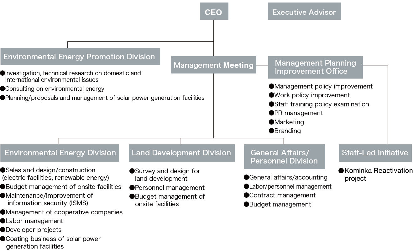 | Businesses | ●Environmental Energy Promotion Division Investigation, technical research and planning, proposals on domestic and international environmental issues, environmental energy consulting, project development and management ●Environmental Energy Division Design/construction of electric facilities, planning/proposals and design/construction of solar power generation facilities ●Land Development Division Land survey and design for land development |