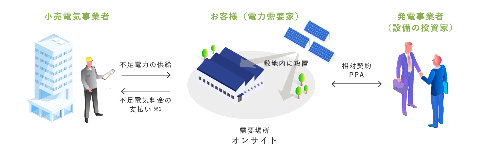 発電事業者が全額出資して設備を設置し、小売電気事業者を介しての電力供給となります。