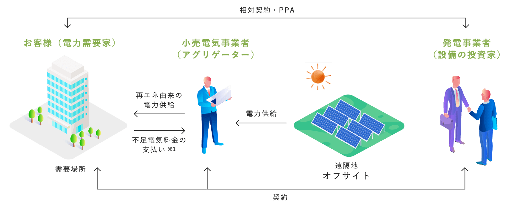 ※企業や自治体などの法人のお客様が対象となります。※20年の契約期間が基本となりますが、相対契約のため個々で契約内容が異なります。※設備の所有権は発電事業者の為、お客様は税制優遇や補助金の利用はできません。※発電電力が不足する場合は、小売電気事業者から電力が供給されるため停電は発生しません。※発電事業者をご紹介できない場合もございますのでご了承ください。