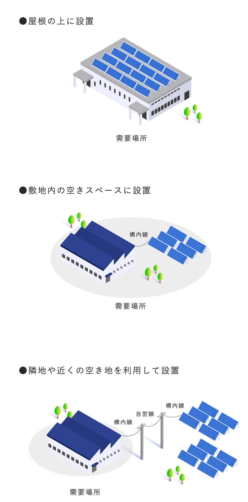 電力需要家の建物の屋根や敷地内のスペース、隣地を利用して設置。送配電事業者の送配電網を使わず、構内線や自営線を通して電力を供給します。