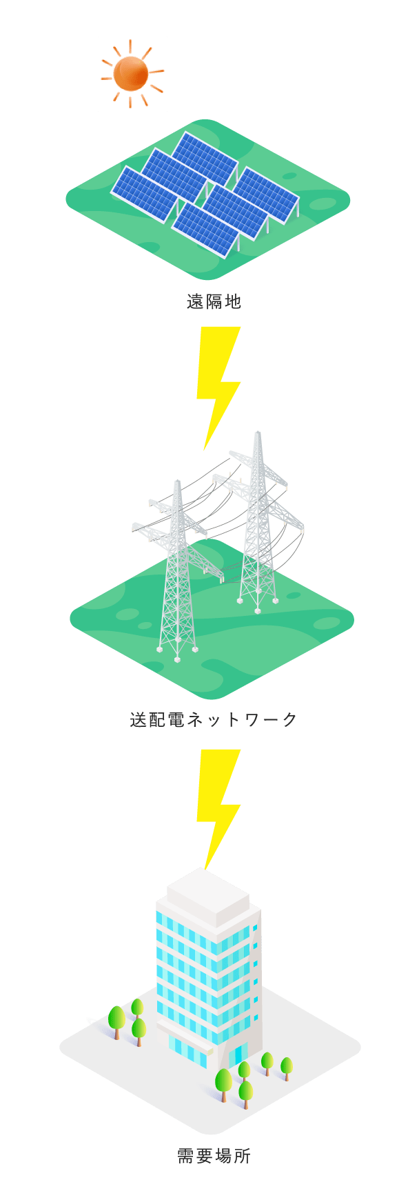 需要場所の遠隔地に設備を設置。そこから送配電ネットワークを経由して電力が供給されます。この場合、小売電気事業者への必要経費や送配電事業者に託送料金の支払いが発生します。