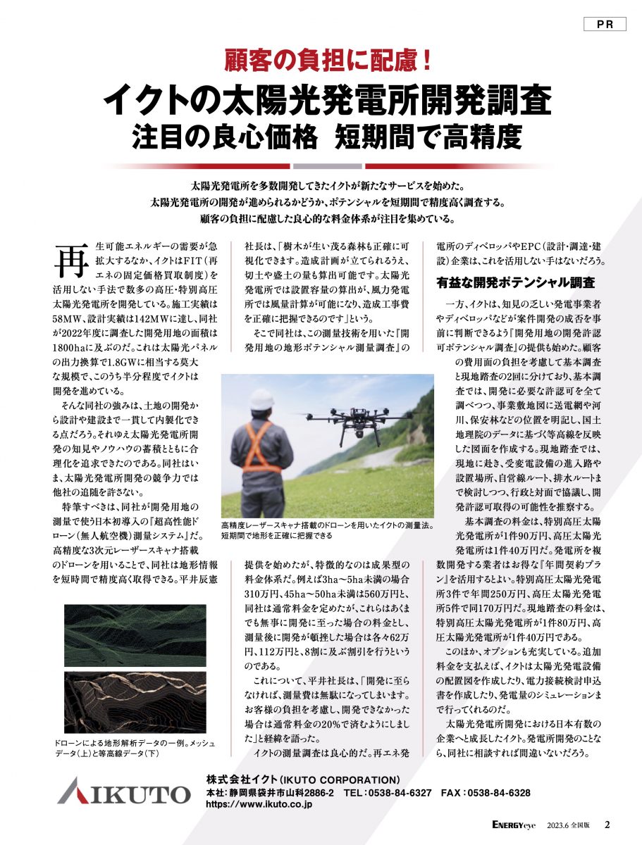 ENERGYeyeにて新サービスについて取り上げていただきました メディア情報 2023.06.14 ENERGYeye全国版6月号(2023年6月14日発行)にて、新サービス「再生可能エネルギー電源開発用地のポテンシャル調査」について取り上げていただきました。今回は、開発許認可ポテンシャル調査の内容についても少し詳しく掲載しております。