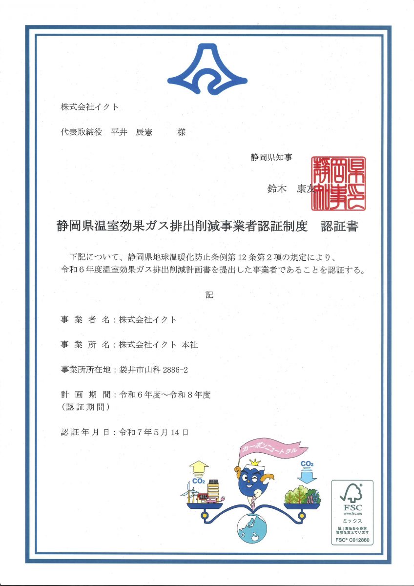 令和5年に静岡県が創設しました「静岡県温室効果ガス排出削減事業者認証制度」に認証されました。