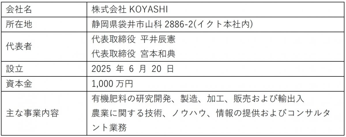 株式会社イクト(本社:静岡県袋井市、代表取締役:平井辰憲)は、有機肥料の製造・販売を通じて持続可能な農業生産を支援することを目的とした新会社「株式会社KOYASHI」を設立したことをお知らせいたします。