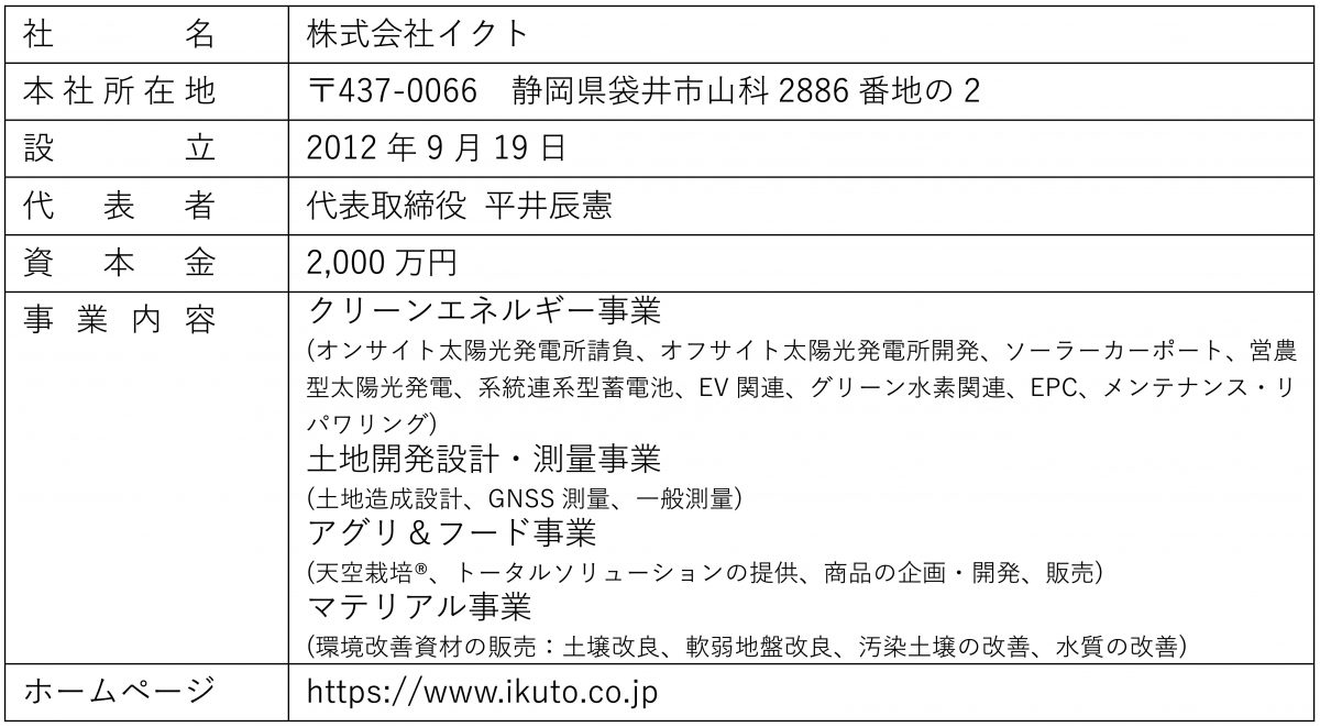 株式会社イクト(本社:静岡県袋井市、代表取締役:平井辰憲、以下 イクト)と、地盤調査・解析・補償サービスなどを展開する地盤ネット株式会社(本社:東京都新宿区、代表取締役社長:石井大樹、以下 地盤ネット)は、再生可能エネルギー(以下 再エネ)の安定供給を目指してソーラーカーポート事業における業務提携契約を2026年4月22日に締結いたしました。