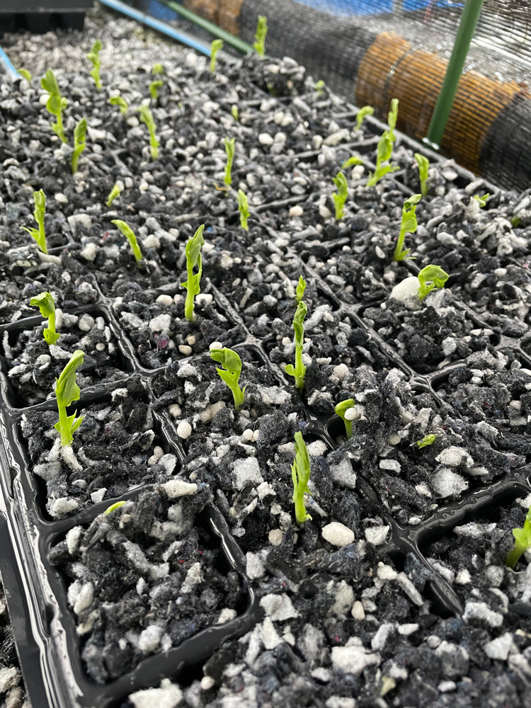 スナップエンドウの芽 2024.10.31 スナップエンドウの芽が伸びてきました。幼い芽が上へ伸びる姿は、赤ちゃんが立ち上がろうとする姿のようで応援したくなります。スナップエンドウはエンドウの一種で肉厚なサヤと中の豆の両方を食べられ、甘味と歯応えが特徴。春の代表的な野菜です。