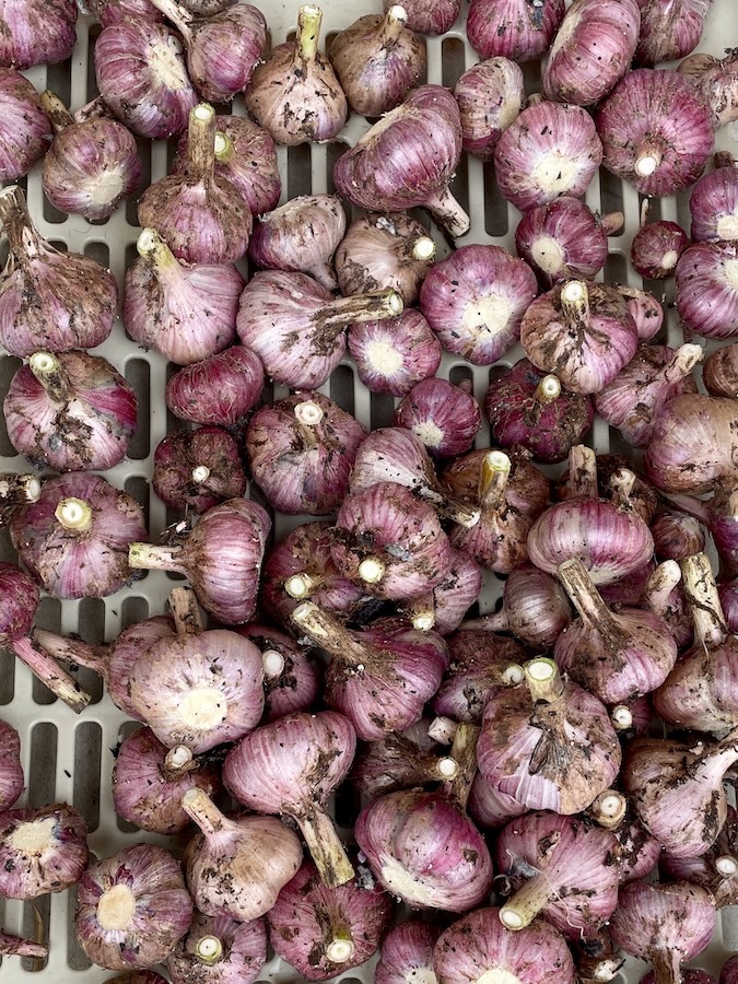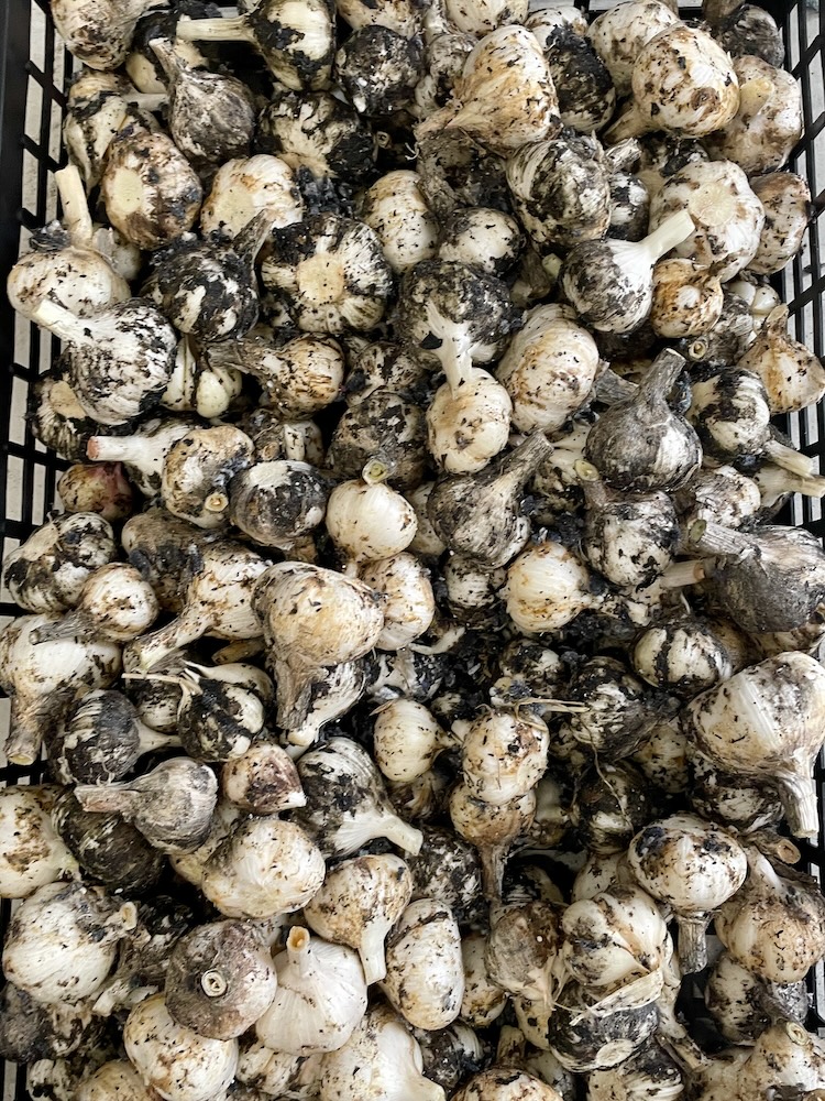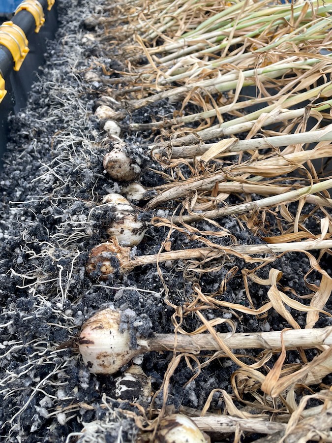 抜いたばかりのにんにくがズラリ。無機質培地では狭い株間(約10cm)でも育てられます。