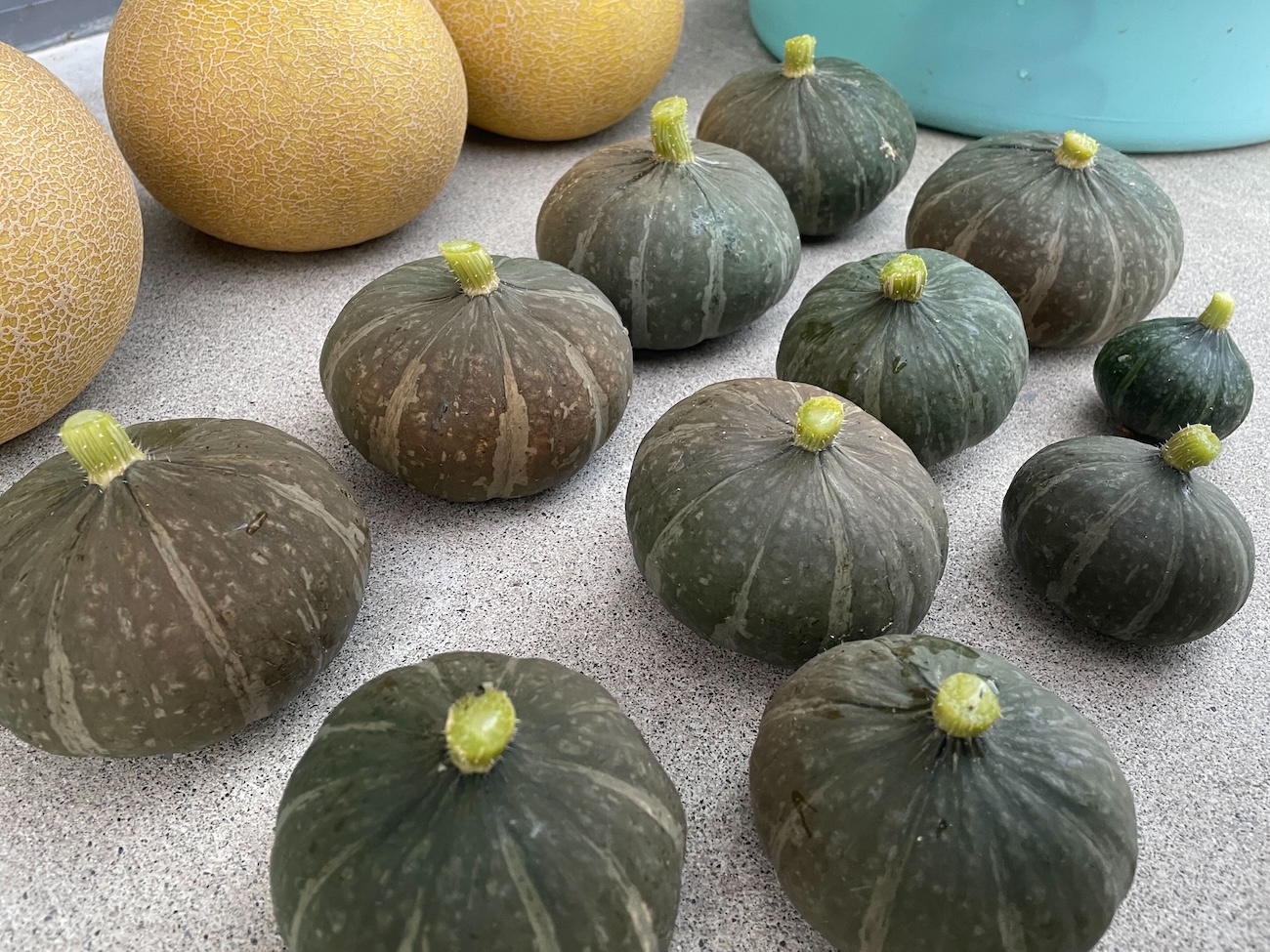 ミニかぼちゃが追熟中 2025.08.20 ミニかぼちゃを収穫しました。一個が500g程の手のひらサイズです。収穫直後のかぼちゃはでんぷんを多く含みます。収穫してからしばらく置くことで次第にでんぷんが糖に変わり、甘くなります。こちらの品種は収穫後2〜3か月間保存することができ、長期間かけてじっくりと甘味が増していきます。食べるのが待ち遠しいです。