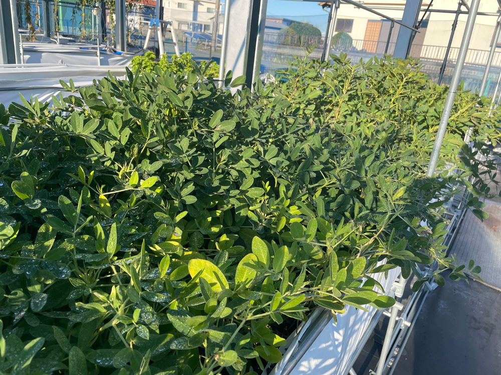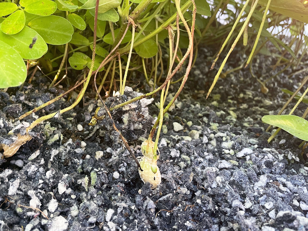 今年の落花生、ゆっくりじっくり実りの秋へ 2025.10.31 10月に収穫予定だった落花生ですが、まだ葉が青々としています。通常、葉が枯れ始めたころが収穫の合図ですが、まだその気配はありません。試しに隅の方の株を掘ってみたところ、実はまだ成長途中のようでした。どうやら収穫は11月にずれ込みそうです。ゆっくりじっくり育って、おいしい落花生になりますように。 試し掘りした落花生。まだ小さいけれど、実がしっかりついてきました。