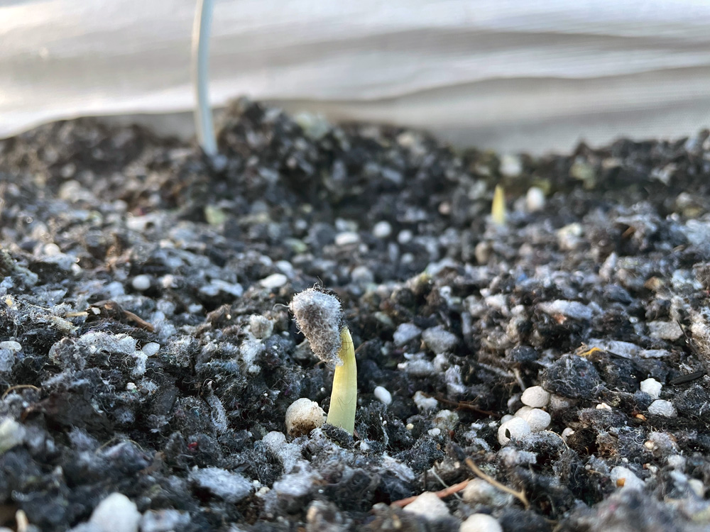ハーリックがひょっこり 2025.11.13 遅めの時期に定植した、葉にんにく専用品種の『ハーリック』。媒地を頭に乗せて、ひょっこり顔を出しました。葉はニラよりも幅広でやわらかく、香りはマイルド。炒めても生でも、食感が楽しめる野菜です。収穫できるのは年明けごろになりそう。これからの成長が楽しみです。 発芽したばかりのハーリック。媒地を押し上げて顔を出しました。