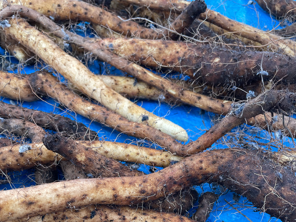 今年の自然薯を収穫 2025.12.11 今年の自然薯を収穫しました。昨年は短かったり細かったりと課題が多く、思うような形に仕上がりませんでした。そこで今年は、その反省を踏まえて栽培条件を見直し、いくつか工夫を加えて栽培しました。その結果、昨年とは違い、長く伸びた立派な自然薯に成長してくれました。まだまだ勉強中ですが、少しずつ理想の形に近づいてきていると実感しています。 ずらりと並んだ今年の収穫分